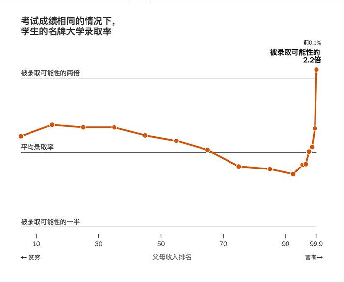 ■7月底,哈佛等精英大学的一众教授发表了一篇轰动世界的论文,用精准的数据量化了富裕孩子爬藤的优势:家庭收入排前0.1%的学生在大学申请流程中,在非学术上获得高分的可能性,是中产学生的1.5倍。