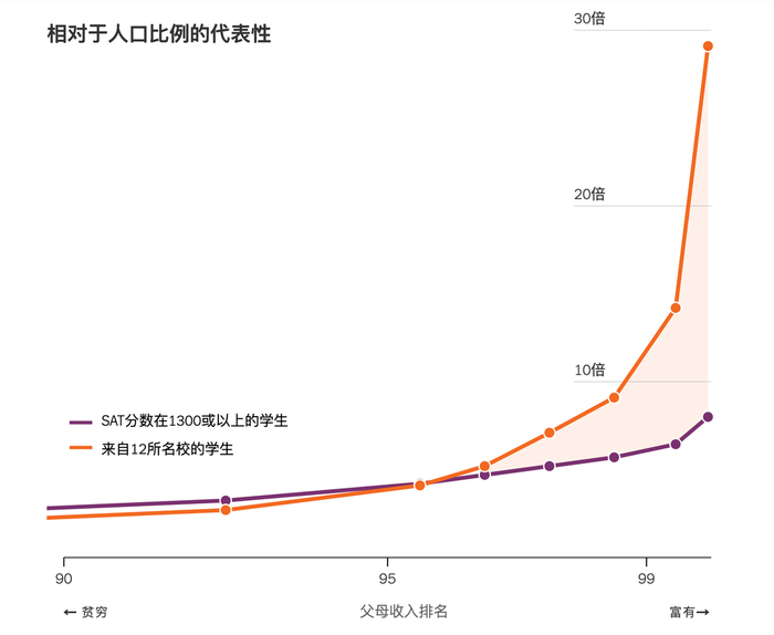 ■哈佛教授Raj Chetty研究发现,在成绩相同的情况下,中产家庭孩子被录取的可能性低于家庭财富顶尖的学生,在一定程度上也低于最贫穷的学生,中产就这样「消失」了