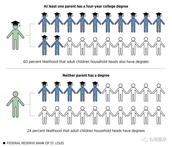 ■根据美国联邦储备银行的数据,父母双方都有至少大学文凭的孩子,获得更高学历的可能性也更高,获得收入也更高2. 一方家长的全职教育: