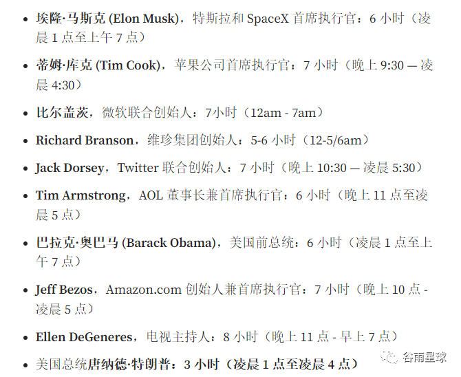 ■外媒Medium统计过超级成功人士的睡眠,绝大多数再6-7小时之间,其中睡觉最少的是特朗普,只需要每天3小时回想起在工业革命初期,社会的上层阶级都会有意识地减少自己的工作量,投入更多的「闲散」时间到音乐、文化、艺术之中。