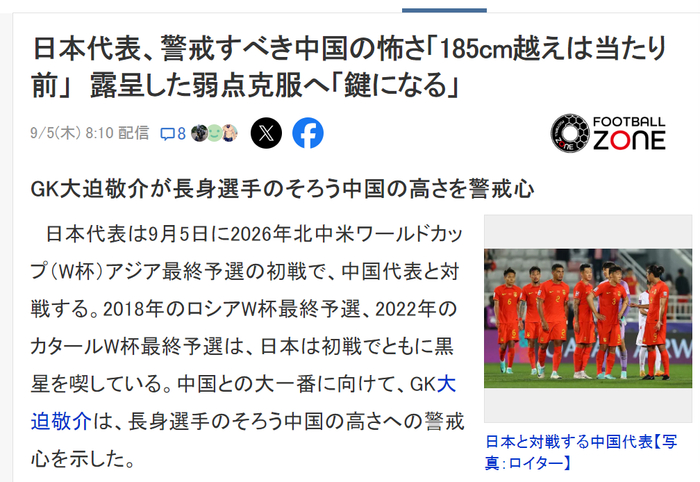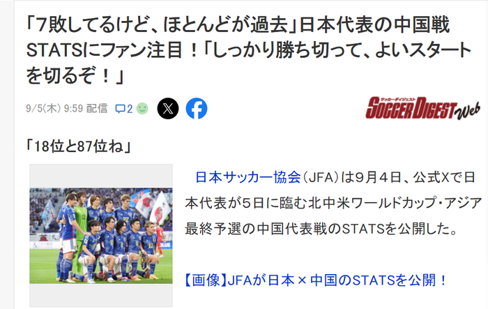 日本专业杂志《足球精选》网页版在9月5日上午9时59分发表了一篇文章,标题叫做《虽然输过中国7次但都太久远 这是世界第18比第87啊》。