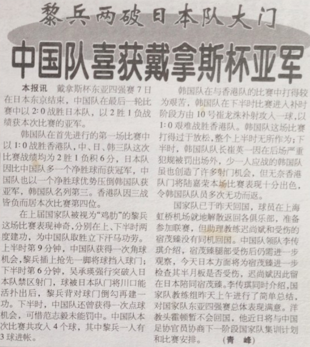 结果当时刚刚被霍顿注入了一丝现代足球理念的中国杀上门去,给了日本队一个2比0的爆喝,黎兵打进了两球。