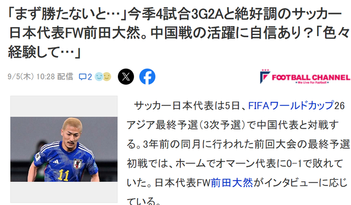 本赛季在凯尔特人已经打进4球有3助攻的前田大然说:“回到日本打开电视就是上一届首场失利,连续两届首场主场失利,想不看到都不行。对手中国并不简单,我们必须从上一届的比赛中吸取教训……我已经不年轻了,会带着自信投入和中国比赛中去的。”