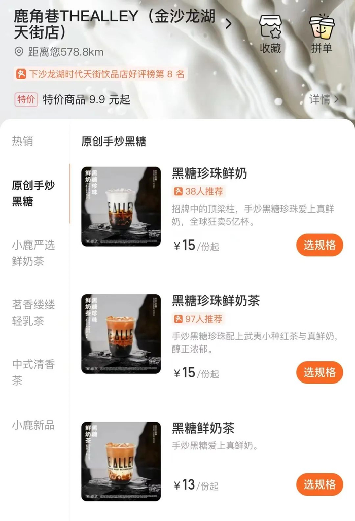 在产品上,升级回归后的鹿角巷仍主打的是手作黑糖珍珠奶茶,强调“鲜奶+黑糖珍珠”的搭配,打出了“要喝就喝真鲜奶”的口号,更加贴合当下黑糖珍珠奶茶“手作”“鲜奶”“低价”的流行趋势。