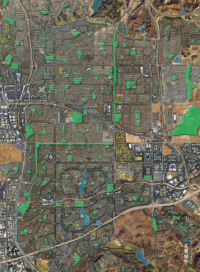 「产业新城」的标签往往让人们忽视了尔湾「生态新城」的身份。作为一个仅仅发展50年的郊区新城,它有着卓越的自然生态条件——美国国家自然地标、面积达3.7万亩的尔湾牧场,同时还被评选为美国第四大绿色城市。