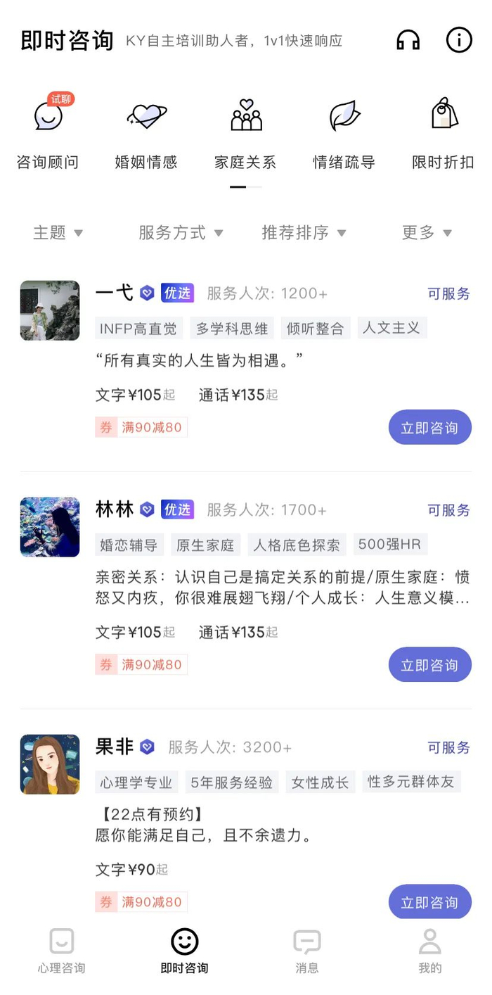 即时咨询使用「单元咨询」模式,以提供“单次效用最大化”的服务,在有限的探询时间中,找到核心,重构问题,拓宽思路,有力而轻柔地给予启发。一次即时咨询就像一次对生命议题的独立探讨,每次都专注解决当下最紧急的困扰,抚平焦躁的情绪,而一次次对话的累积,让改变悄然发生。