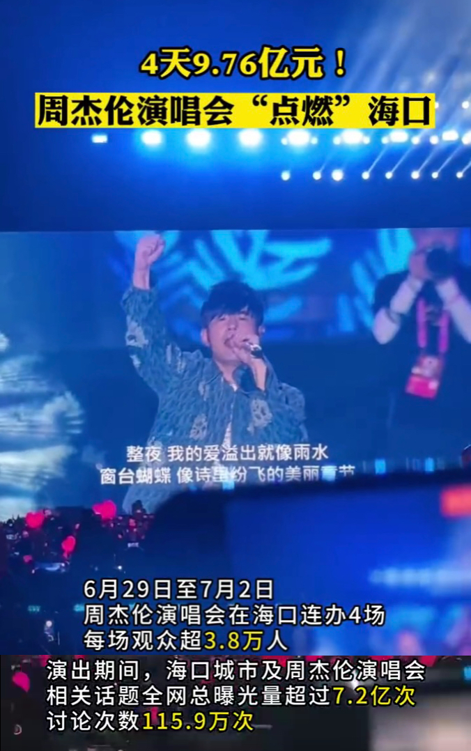 从去年开始,海口就争取包括周杰伦、薛之谦在内的头部歌手来海口举办演唱会,周杰伦在2023年中更是一口气在海口连开四场,仅用四天就为海口吸引了十五万观众,其中近十万观众来自省外,跨城观演比例达92%,跨省观演比例达68%,直接带动旅游收入9.76亿元,是端午假期旅游收入的3倍。