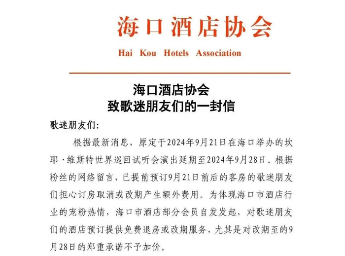 9月18日晚,海口酒店协会发布通知,宣布海口市40家重点旅游接待酒店将为歌迷朋友们提供免费退订及免费改期预订服务。航司虽表示无法凭借门票区分歌迷与普通旅客,但也称“歌迷朋友在离岛时可凭门票提供更加优质的专属服务”。
