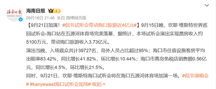 (图源:微博@海南日报)而今年侃爷试听会的成功举办,更是将海口的演唱会经济提升到一个新高度。