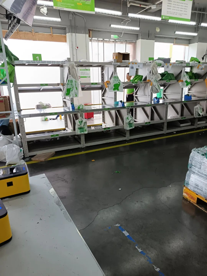 分拣的最后一环节是把商品打包好放在打包台。(图/作者 摄)为了跟上小寒,我也不得不跑起来,很快背上就起了一层薄薄的汗。但即便如此,有时候一回过神来,她就已经消失在眼前的仓库,钻进下一个货架去了。她说,每个全职分拣员每天步数都是3万起步,以每步0.7米算,上班12小时,分拣员基本日行21公里以上。