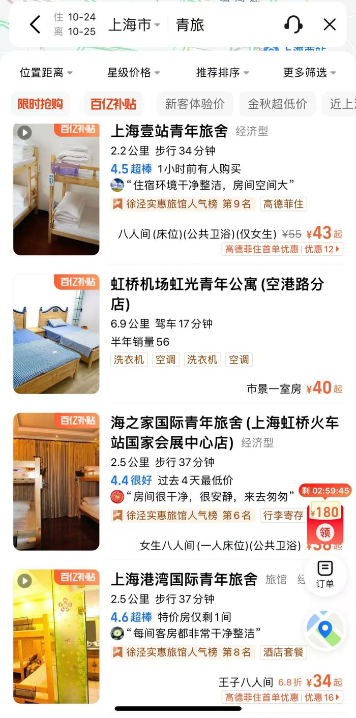 小刘告诉我,在地图上能检索到许多这样的青旅。(图/地图软件截图)这两年,他对自己生活的这座城市没什么感知,要说最了解的地方,大概是医院——由于眼睛有一些问题,他跑过好几次医院。除此之外,他的活动范围几乎就是工作的门店和宿舍。每个月他会有四天的休息时间,我问他会去逛逛吗,他说“一个人也不知道去哪里”。