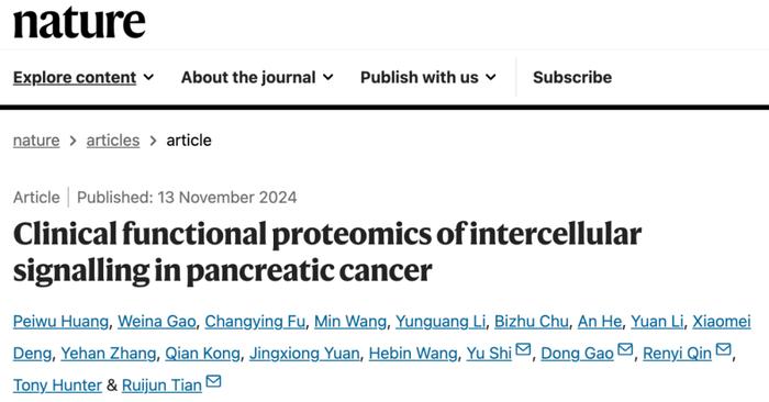 2024年11月,南方科技大学田瑞军、华中科技大学同济医学院附属同济医院秦仁义、中国科学院分子细胞科学卓越创新中心高栋等人在国际顶尖学术期刊 Nature 上发表了题为:Clinical functional proteomics of intercellular signalling in pancreatic cancer 的研究论文。