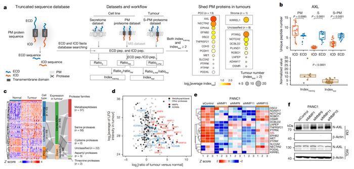 PDAC中PM蛋白的一般脱落机制的探讨总的来说,这项发表于 Nature 的研究描绘了由分泌配体和PM受体介导的PDAC中PCC和间质细胞之间的细胞间信号网络的全景图——TMEPro。TMEPro整合了具有时空分辨率的多维蛋白质组信息,全面描述了PDAC患者和基因工程小鼠PDAC模型中PCC和基质细胞之间的功能相互作用,为PDAC的科学研究、预防诊断和临床治疗提供了极具价值的全面资源。