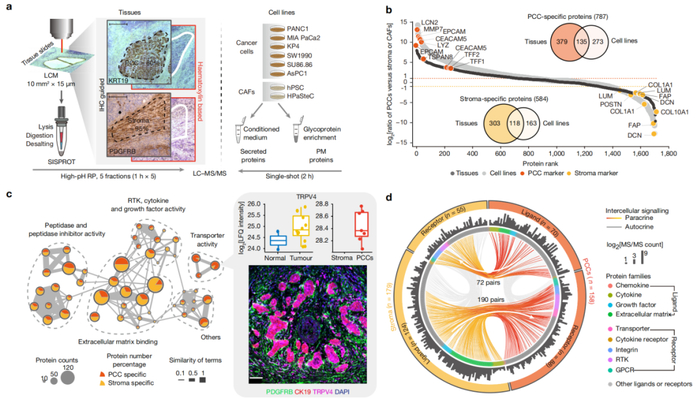 缺乏可靠的早期诊断生物标志物、高度异质性的肿瘤微环境(TME)以及对几乎所有现有治疗方法的顽强抵抗,是PDAC患者预后不良的主要原因。令人遗憾的是,长期以来,关于PDAC癌细胞与基质细胞之间相互信号传递的蛋白质组水平的功能信息在很大程度上是缺失的,这也严重影响了PDAC的预防诊断和治疗。