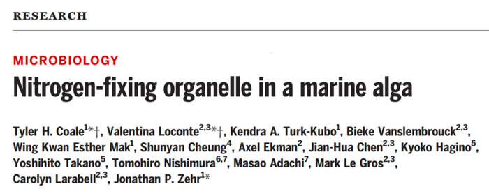 2024年4月11月,加州大学圣克鲁兹分校、加州大学旧金山分校等机构的研究人员合作,在国际顶尖学术期刊 Science 上发表了题为:Nitrogen-fixing organelle in a marine alga 的研究论文,该论文还被选为当期封面论文。