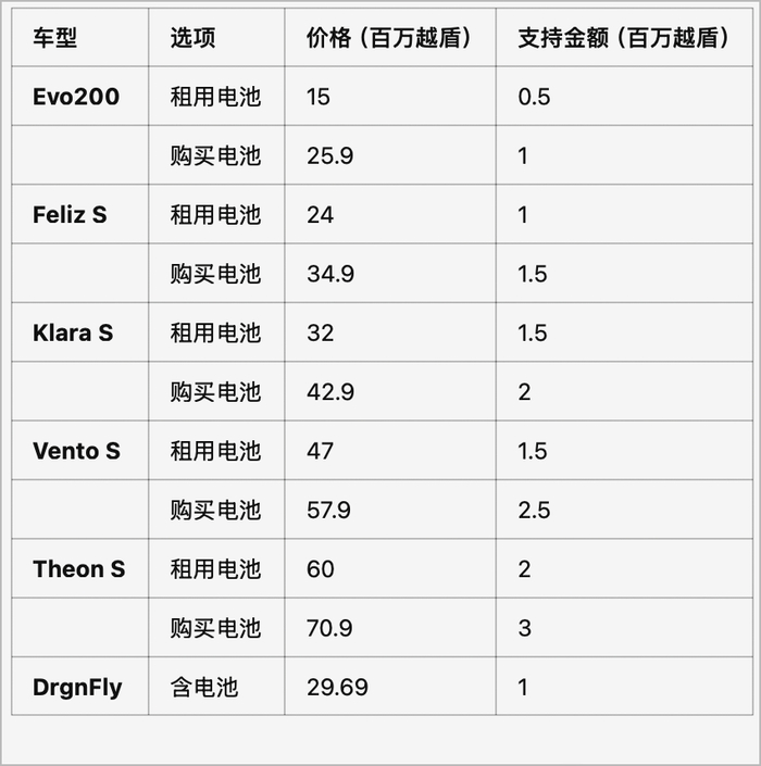 购买电动摩托车或电动自行车的客户可获得 50 万至 300 万越盾的支持,具体如下: