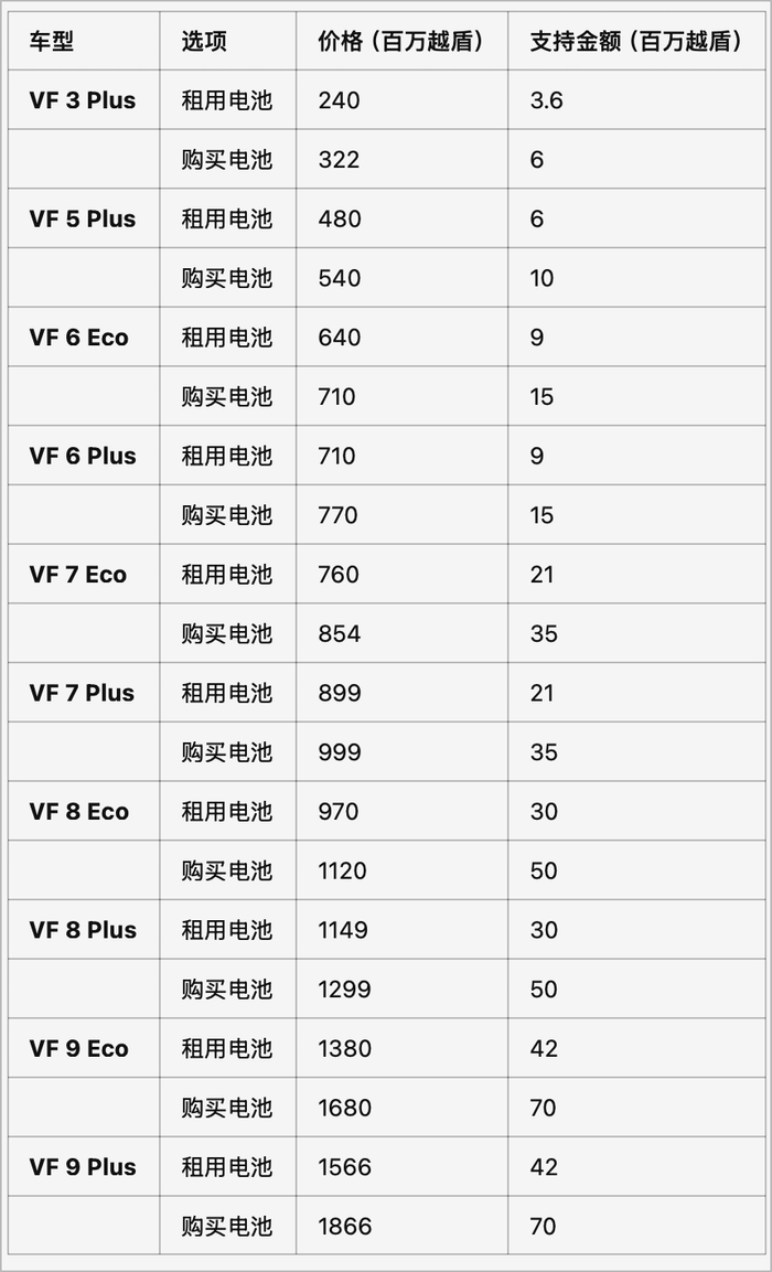 根据政策,选择购买电池的客户获得的支持金额约为租用电池客户的 1.67 倍。最高支持金额为 7000 万越盾,适用于 VF 9 Plus 的购买电池选项,而 VF 3 的最高支持金额为 600 万越盾。