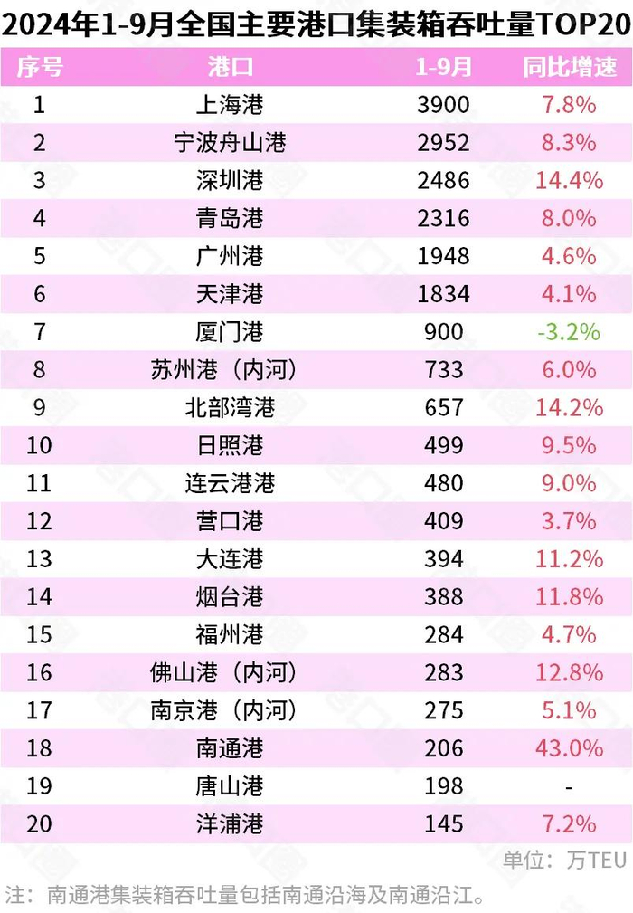 2024年前三季度,港口集装箱吞吐量排名,宁波-舟山港位居第二,天津港位居第六。