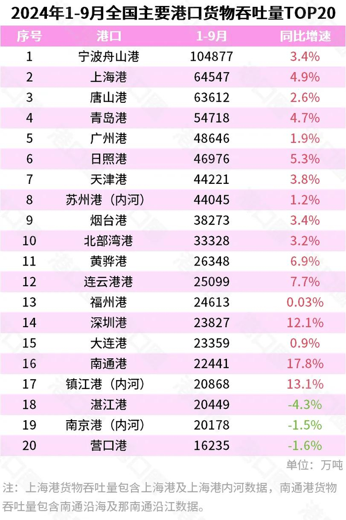 2024年前三季度港口货物吞吐量排名,宁波-舟山港排第一,天津港排第七。