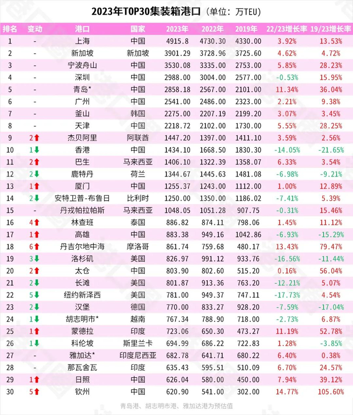 2023年,港口集装箱吞吐量排名,宁波舟山港全球第三,天津港全球第八。