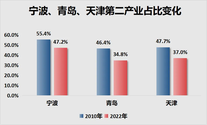 同期的宁波,2010年的第二产业占比55.4%,2022年为47.2%,占比合理下滑,广义制造业在经济中占比仍接近一半。