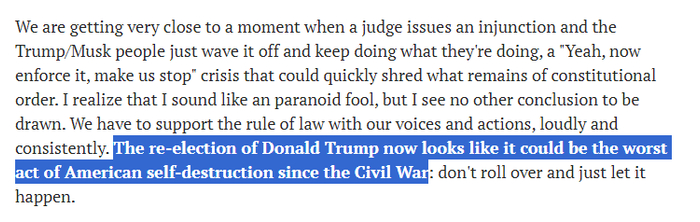 “唐纳德·特朗普的连任,现在看起来可能是自内战以来美国自我毁灭的最糟糕行为”。