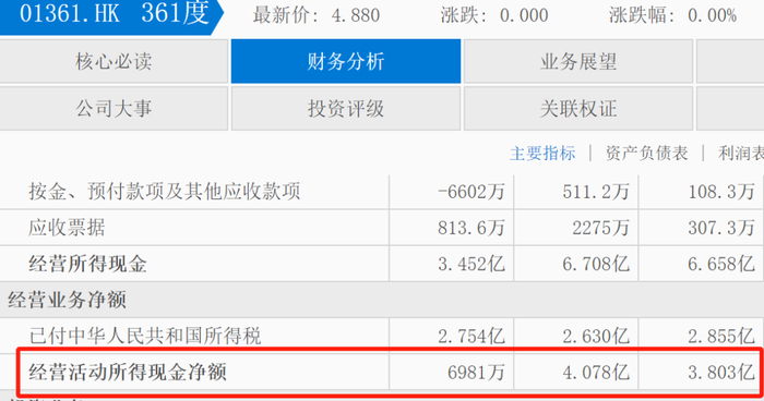 深耕三四线城市的下沉市场,极易造成库存和影响现金流。这一点在财报上也有所体现,财报显示,截至2024年,361度的存货周转天数增加了14天,在2023年的93天基础上增长至107天。库存金额也由2023年的13.5亿元增长至21.09亿元,同比增长了56.2%。经营活动现金净额同比下滑82.9%,仅为6981万元,上一年同期则为4.078亿元。