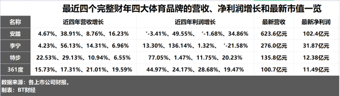 不仅营收增长较高,361度的归母净利润同样高速增长,由2021年的6.017亿元增长至2024年的11.49亿元,期间增速分别为44.97%、24.17%、28.68%和19.47%。BT财经整理四大体育品牌近四年的营收和净利润增长情况发现,只有361度连续四个完整财年保持营收和净利润两位数以上的增长,其中安踏和李宁的净利润都出现过下滑,特步2023年的净利润增幅也曾低至1.47%。