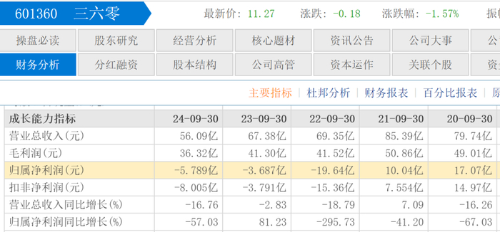 2022年第三季度,360净亏损15.66亿元,2022年全年净亏损22.04亿元,这是360借壳回A以来首次出现亏损。这一消息犹如晴天霹雳,震惊了整个资本市场。投资者纷纷抛售股票,360的股价也应声下跌。自此,360陷入长期亏损之中,连续9个季度亏损,累计亏损金额28.76亿元。2024年前三季度360毛利率高达64.74%,但净利率则为-10.53%。2024年预计净亏损7.7亿元,而361度净利润11.49亿元,等于比360多赚了19.2亿元。