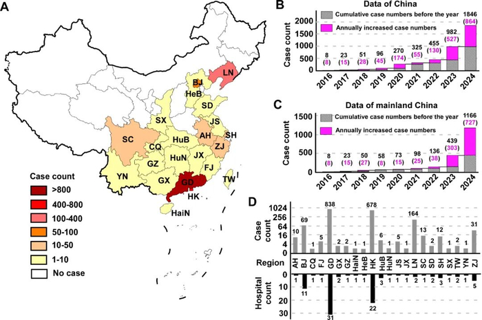 图. 中国耳念珠菌病例的时空分布。(A)耳念珠菌病例的地理分布热图;(B)2016-2024年中国耳念珠菌年度病例数的变化趋势;(C)中国大陆地区(不包括港澳台)年度病例数的变化趋势;(D)不同地区累计病例数和涉及的医院数。