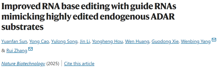 [1]Sun, Y., Cao, Y., Song, Y. et al. Improved RNA base editing with guide RNAs mimicking highly edited endogenous ADAR substrates. Nat Biotechnol (2025). https://doi.org/10.1038/s41587-025-02628-6