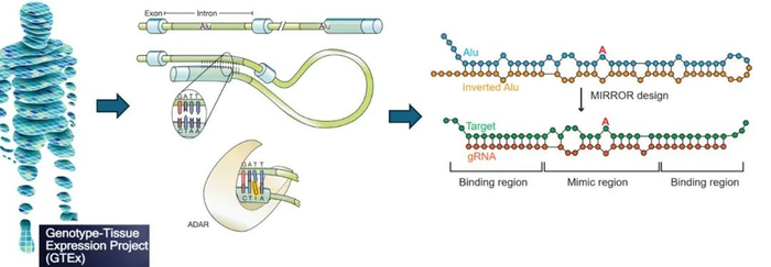 研究团队首先利用GTEx数据集系统性鉴定出超过16万个Alu编辑位点的倒置Alu对,从而构建了迄今为止规模最大的内源性ADAR双链RNA底物结构图谱。在这一过程中,他们进一步筛选出高编辑水平的Alu序列——这些经过数百万年自然选择优化的双链RNA揭示了ADAR识别底物的关键结构特征。基于这一发现,团队开发出一种模拟天然底物构象的gRNA设计算法,并结合高通量细胞内筛选系统,从数千种候选MIRROR gRNA中筛选出最为高效的版本。