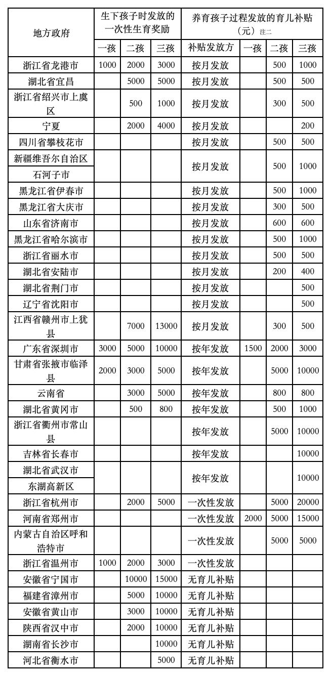 注二:按月或按年发放育儿补贴的,除了湖北省武汉市东湖高新区补贴到孩子六周岁之外,均只补贴到三周岁。