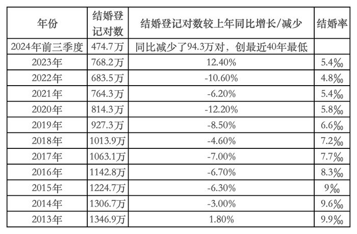 即便如此,相比于庞大的结婚适龄人口,现在的结婚率也显得低了一些。如表3所示,民政部相关数据显示,自2013年达到最高点以来,结婚率一路下行。2023年有所反弹(原因是前几年新冠疫情期间“被耽误”的新人集中登记结婚),但也只是昙花一现,2024年前三季度出现了更加猛烈的下跌。