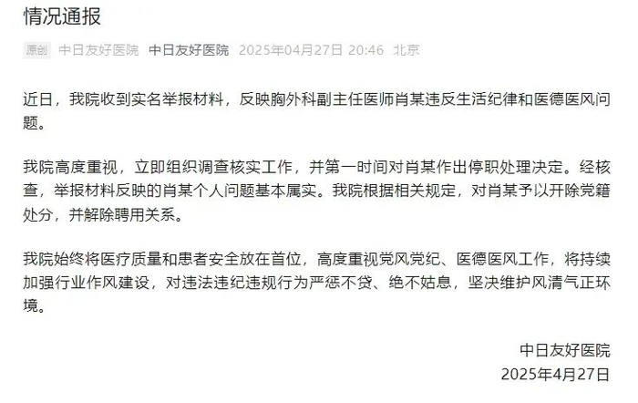 4 月 27 日晚,中日友好医院发布通报称:经核查,举报材料反映的肖某个人问题基本属实。我院根据相关规定,对肖某予以开除党籍处分,并解除聘用关系。