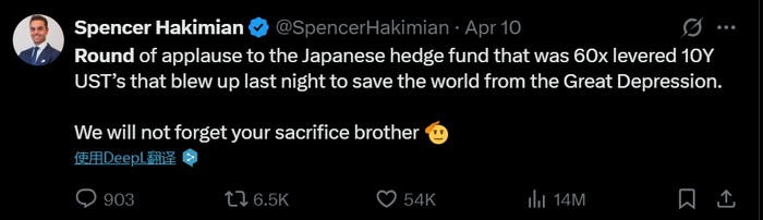 但机构却没这么好运了。次日,日本Tolou Capital的创始人斯宾塞·哈基米在推特上曝出,有日本对冲基金因为60倍杠杆押注10年期美债而爆仓。“它的爆仓让世界免于进入大萧条的时代。”他说道,“兄弟,我们不会忘记你的牺牲”。