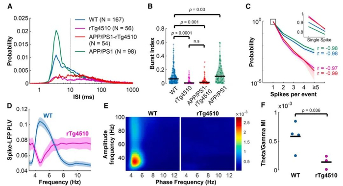 ▲野生型小鼠和阿尔茨海默病模型小鼠的海马神经元发放动作电位的模式不同(图片来源:参考资料[1])比较不同小鼠的海马神经元放电特征后,研究人员发现,即使没有Aβ的影响,仅仅是tau蛋白就会让神经元爆发动作电位的特征发生异常,尤其是会显著抑制神经元自发的“爆发式放电模式”。