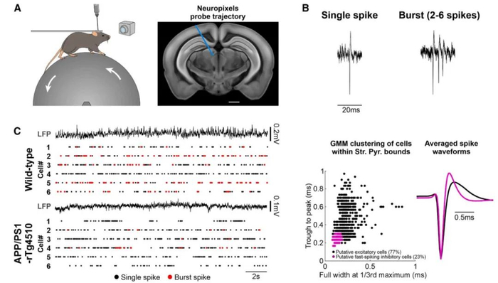 海马神经元之间的正常交流依靠电信号的有序发放,在电生理记录下表现为单个的动作电位或一连串的动作电位。在这项研究中,科学家们使用前沿的高分辨率体内探针,在小鼠清醒、运动等不同状态时记录到海马神经元发放动作电位的模式和各类参数,从而解码海马神经元之间的交流。这些小鼠有一部分经过基因操作模拟了人类阿尔茨海默病患者的基因特征,并会随着年龄增长在脑中出现Aβ病理或是tau蛋白缠结或是这两种病理特征。
