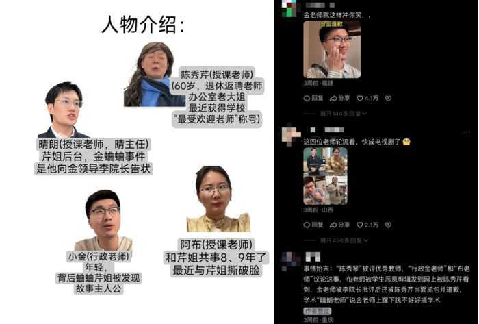 俏黄蓉本人的生活处境、部分基层工作者的难言之隐隐没在调侃和刻板印象之中,“行政老师宇宙”也在网友们的整理中渐渐成型,对现象的调侃力度逐渐转向“行政老师人际关系图谱”研究的热情。