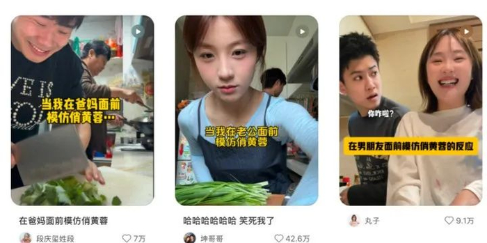 (各类“俏黄蓉”模仿视频)俏黄蓉和韩国霸总的模仿视频的拍摄地点基本在厨房或者餐桌,模仿者突然使用被模仿者的表达方式说话,旁观者反应大多都是从疑惑到惊吓,甚至怀疑模仿者“被上身”,家人之间最真实的互动模式被巧妙展示出来。比如博主@鲨姐和老王的异常的模仿视频中,老王迅速与鲨姐“合流”一起哈哈大笑,网友评论“这俩搞笑玩意儿,谁研究的呢”。