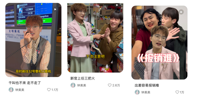 比如对于某一群体的模仿和批判:模仿某些行政工作人员“踢皮球”“看人下菜碟”。类似的模仿有更早的@钟美美等网红,模仿银行办事职员、车站颐指气使的个别工作人员,职场上穿小鞋暗自里耍阴招的上司和同事等等。