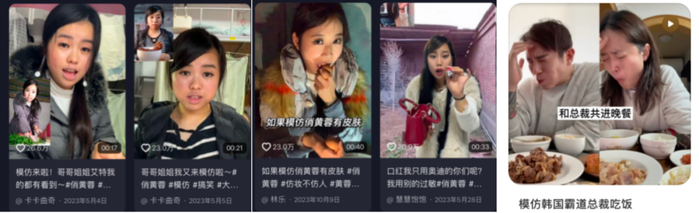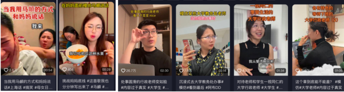 被模仿对象涵盖多元领域:从说唱歌手马頔,到网络红人俏黄蓉,再到吃相夸张的韩国总裁,乃至大学生日常接触中个性“不讨喜”的行政老师,皆成为创作素材。