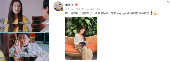 更有观众发现其中的“巧思”——两次真人秀综艺,黄圣依“展演”自己的亲密关系,将生活琐事和争吵细节平铺在观众面前,来龙去脉一目了然。她避免了直接沟通的冲突,而达到了“不言自明”的效果。