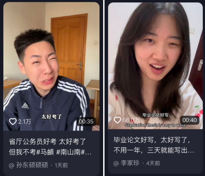 模仿首先是一场高效的兼具筛选与联结双重功能的游戏。这些二次创作看似戏谑、莫名其妙,但是完成了精准的群体识别:比如能在“模仿行政老师三连问”评论区打出“气死我了我经历过一模一样”的人,自动归入共情的阵营;而留言“至于吗”的观众,则被无形中划出讨论。