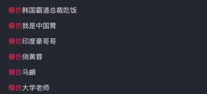 抖音“模仿xx”热度推荐词前六中,有四个是刚刚兴起的模仿挑战。