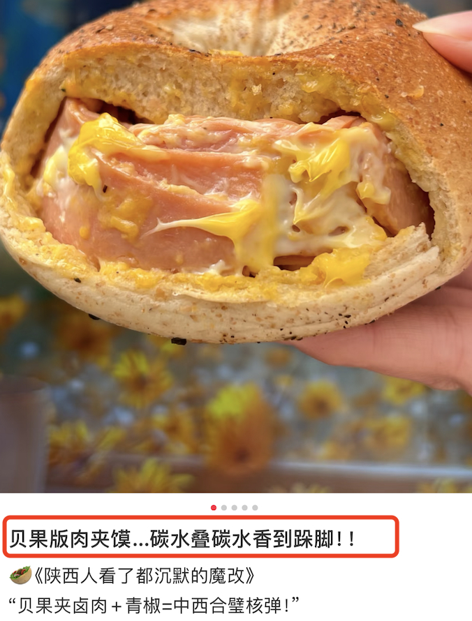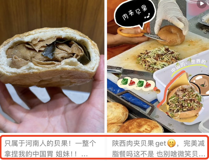 首先是内容物变化:贝果夹馅从烟熏三文鱼、奶油奶酪变成卤肉、酸菜、辣条,甚至油泼辣子。