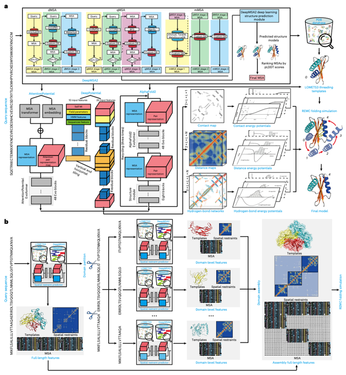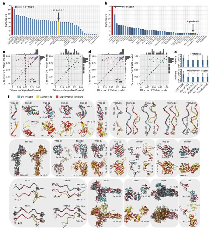 该研究开发了一种新的蛋白质结构预测工具——D-I-TASSER(deep-learning-based iterative threading assembly refinement,基于深度学习的迭代线程装配优化),在蛋白质结构预测权威比赛 CASP15 中碾压所有对手。其在单结构域、多结构域的蛋白质结构预测方面均优于 AlphaFold2 和 AlphaFold3。