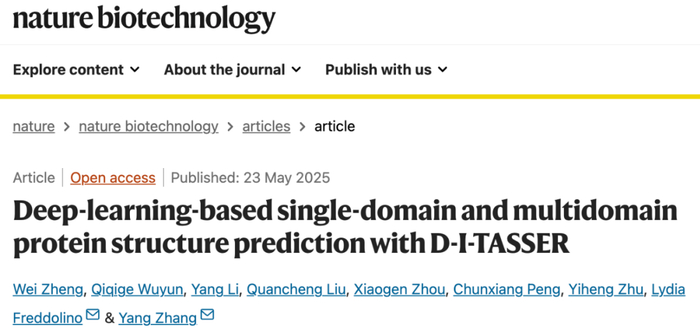2025 年 5 月 23 日,南开大学统计与数据科学学院郑伟教授联合新加坡国立大学张阳教授、密歇根大学安娜堡分校及密歇根州立大学的研究人员,在 Nature 子刊 Nature Biotechnology 上发表了题为:Deep-learning-based single-domain and multidomain protein structure prediction with D-I-TASSER 的研究论文。