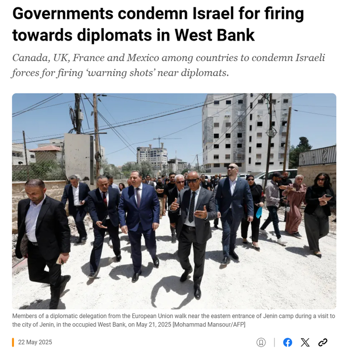 5月22日,半岛电视台报道称,多国对以军向外交使团开枪的行为表示谴责。