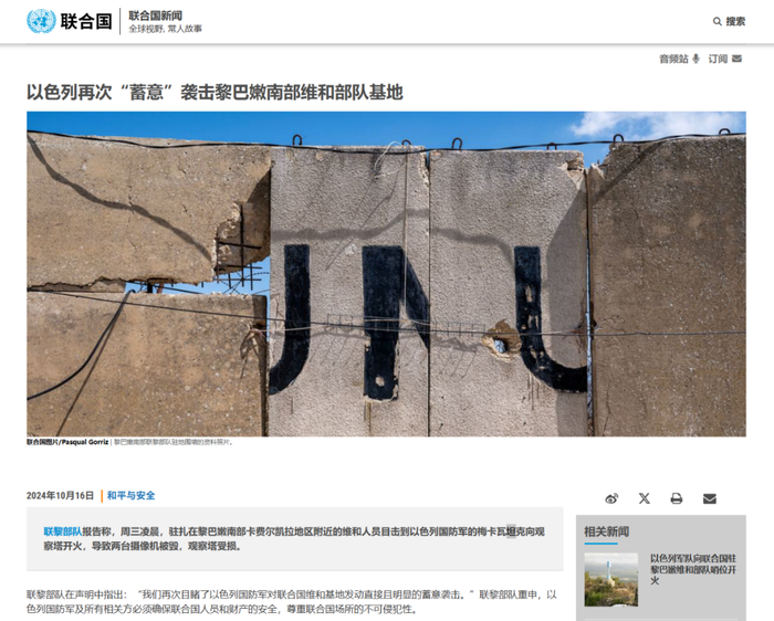 2024年10月,联合国报道称,以色列袭击黎巴嫩南部维和部队基地。